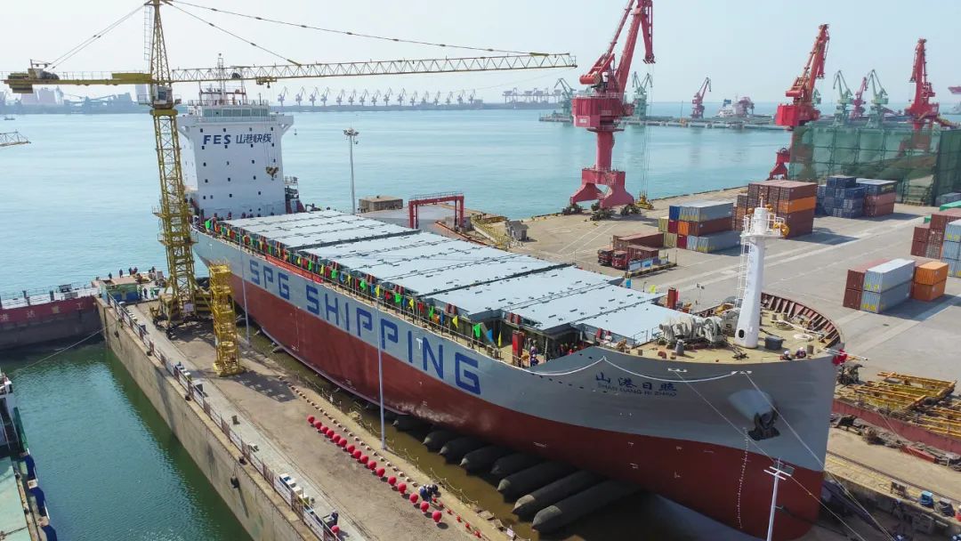 山東港口裝備,為山東港口航運“量身定制”的首艘集裝箱船下水。
